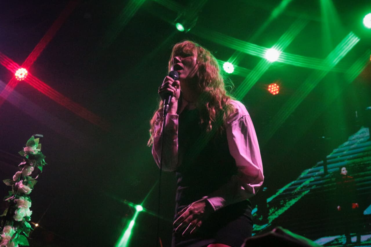 El espectáculo inició, como no podía ser de otra manera, con la proyección de unas emblemáticas barras de color que nos transportan a las teles de tubo sin señal seguido a la presentación de un VHS de Gativideo. Fue, además de una noche de música, una noche de cine: con una historia que se animó a contar la íntima transformación de un mismo personaje en cada canción. Así se plantó Delfina Campos en el escenario, un cuerpo que lo ocupó todo y atrajo la atención de cualquier alma que haya pasado por el Niceto.