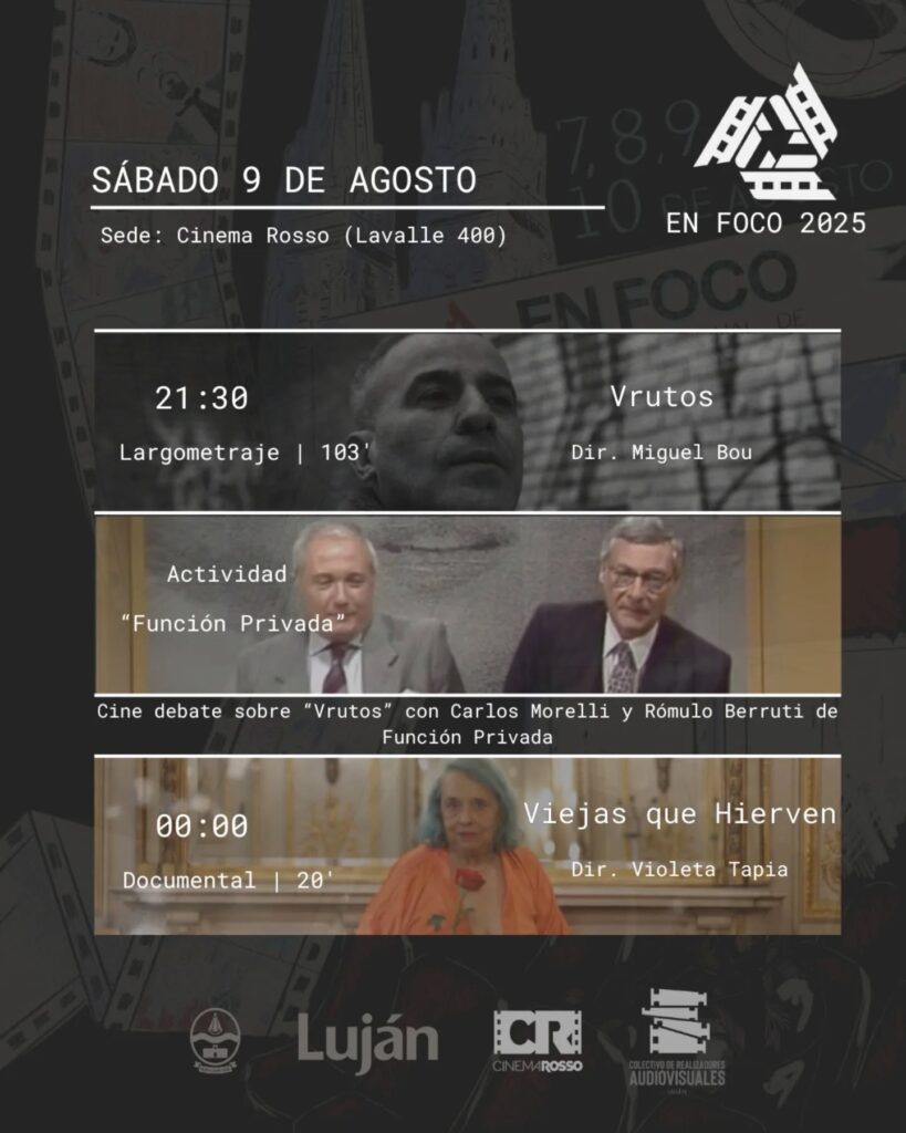 A las 21:30 se proyectará el largometraje “Vrutos”, dirigido por Miguel Bou y que contará con una actividad de cine debate sobre este film junto a Carlos Morelli y Romulo Berruti de Función Privada, programa emblemático de cine que estuvo al aire durante 18 años durante los ’80 y ’90. Finalmente, a las 00:00 se proyectará el último cortometraje documental del día: “Viejas que hierven”, dirigida por Violeta Tapia.