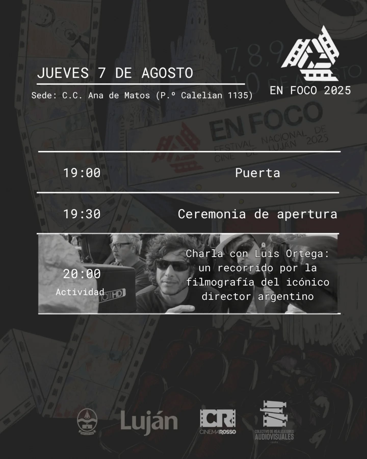 El jueves 7 las 19:30 se llevará a cabo la ceremonia de apertura del evento en el Centro Cultural Ana de Matos (P.º Calelian 1135). Luego, de las 20:00 a 21:00, en el mismo espacio, se realizará la charla con Luis Ortega: “Un recorrido por la filmografía del icónico director argentino”. La inscripción a esta actividad es gratuita y se pueden inscribir haciendo click acá (https://docs.google.com/forms/d/1ZujLNXGRmBWPa0J40GM9ofj5sveUXh3GjUPowPXou2Y/viewform?hl=es-419&pli=1&hl=es-419&pli=1&edit_requested=true) .